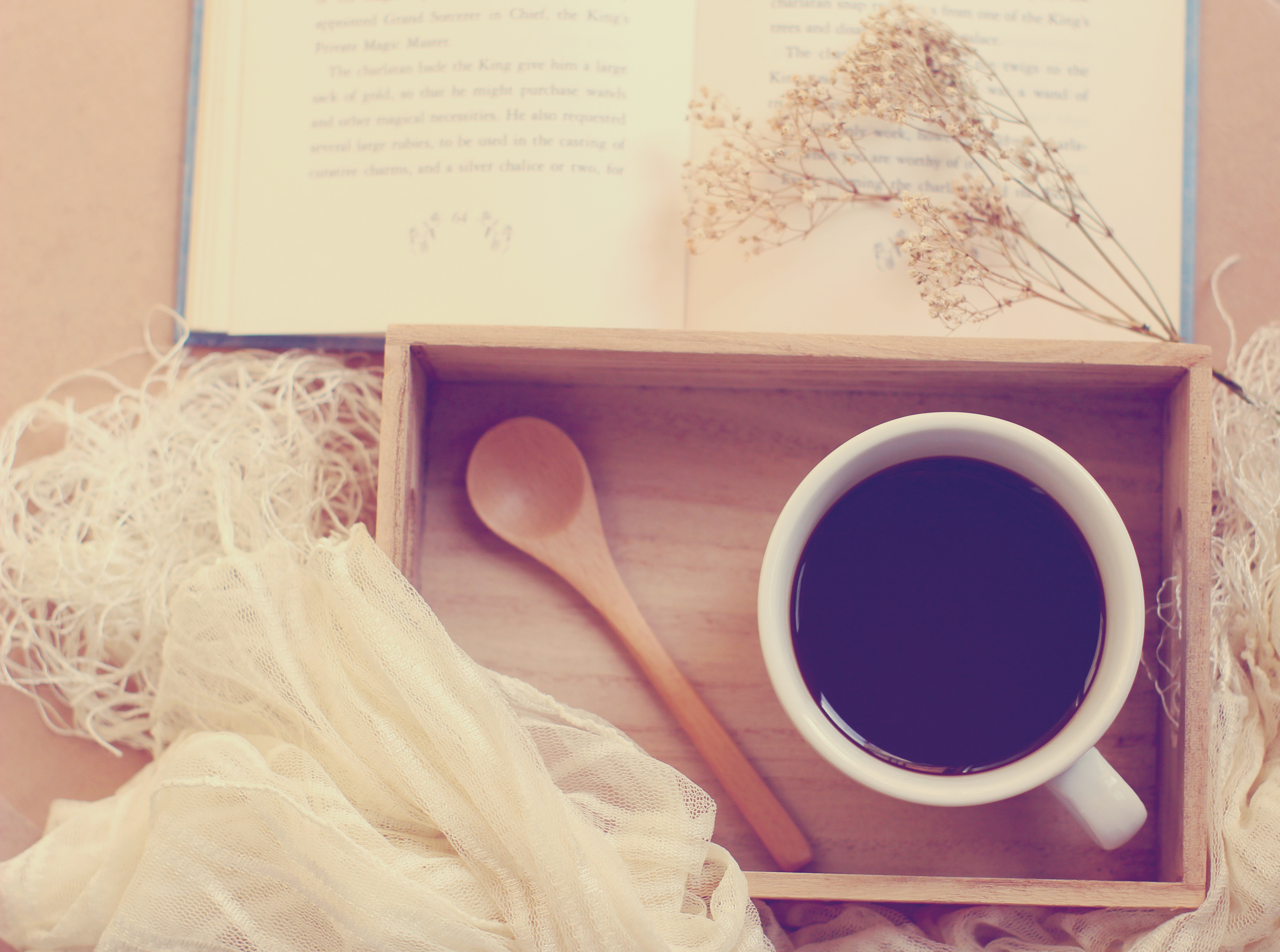 Black coffee and spoon on wooden tray with book, retro filter effect